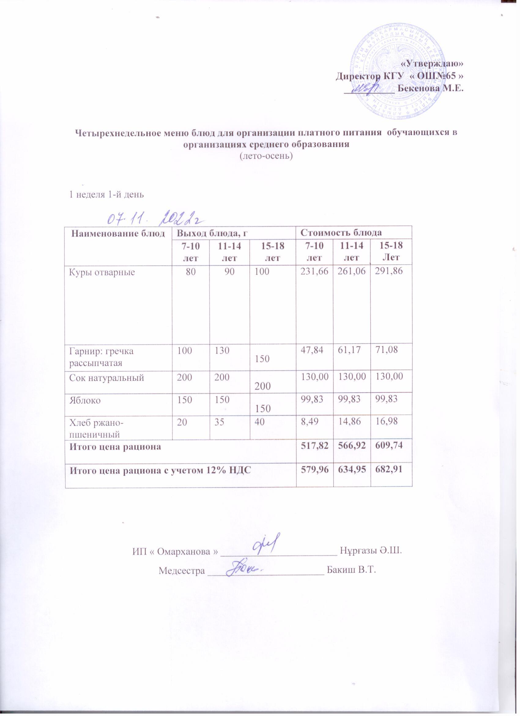 07.11.2022 жылға арналған ақылы мәзір.--Платное меню на 07.11.2022год