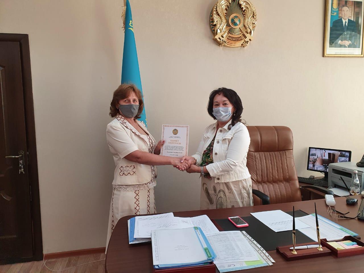 Почетной грамотой Министерства образования РК награждена учитель русского языка КГУ ОШ №65 Радионова Елена Викторовна, за успехи в практической подготовке учащихся, развитии их творческой активности и самостоятельности, обеспечении единства обучения и воспитания.