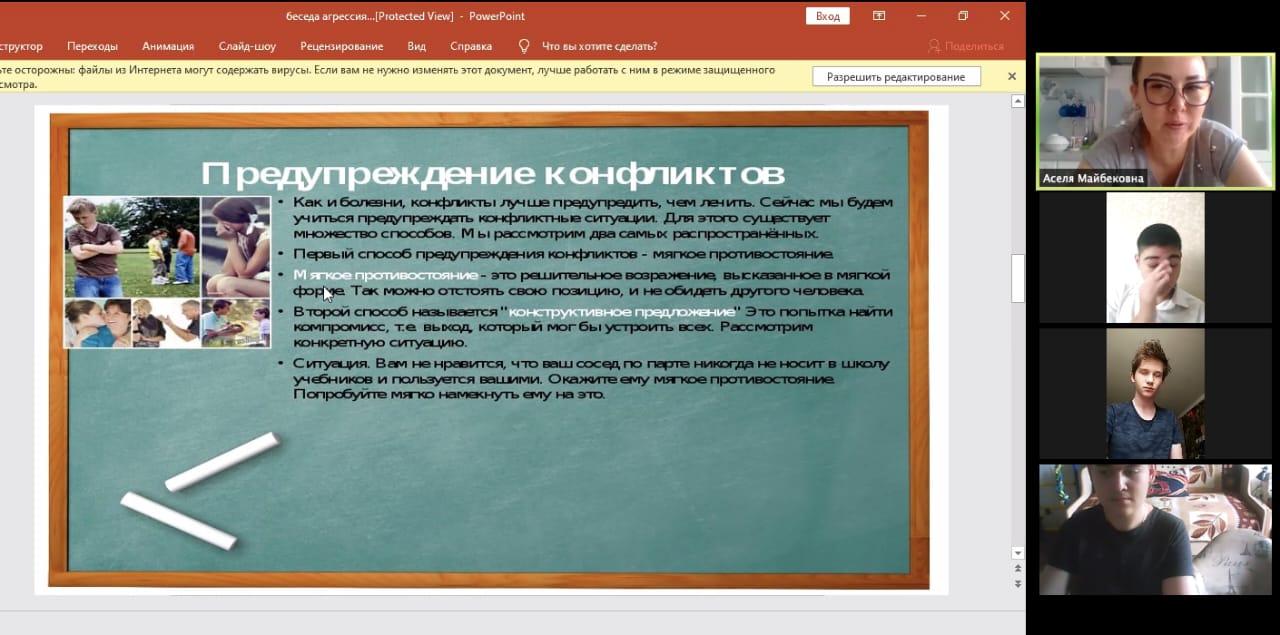 11 мамыр 2021 0 1 2 3 4 5 Беседа " Агрессия и разрешение конфликтов" Психолог школы Садыкова А.М провела беседу среди учащихся 8-11 классов по теме " Агрессия и разрешение конфликтов"
