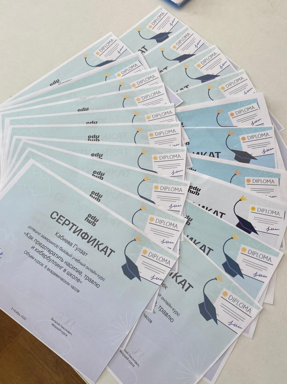 Мектебіміздің педагогикалық ұжымы мен әкімшілігі ЮНЕСКО-ның eduhub.pro сайтында «Мектептегі зорлық-зомбылықтың, қорлаудың және кибербуллингтің алдын алу жолдары» тақырыбында семинар өтіп, сертификатқа ие болды.