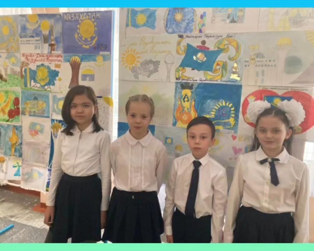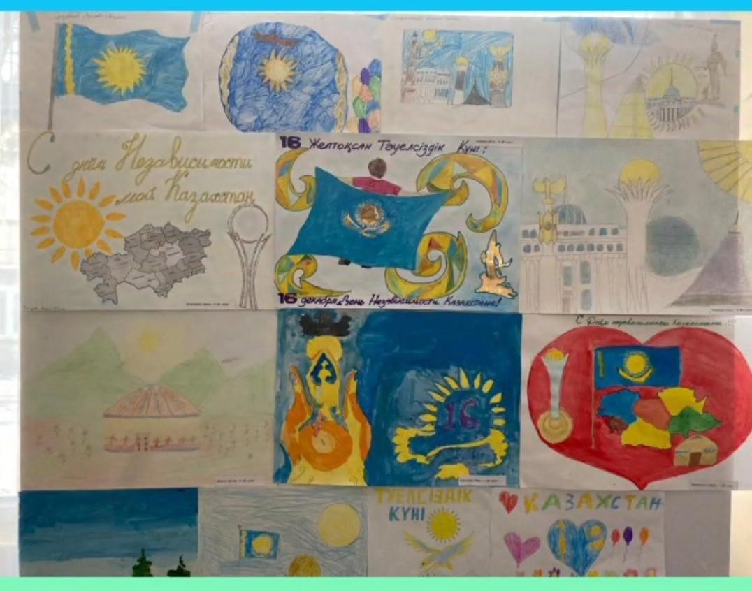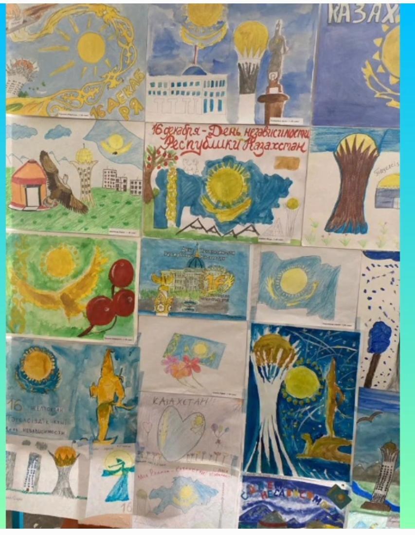 По случаю провозглашения независимости Республики Казахстан 14 декабря была организована выставка картин среди начальных классов нашей школы. Учащиеся рисовали картинки разными цветами в соответствии с заданной темой, вешали эти картинки и показывали другим учащимся.