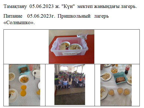 05 маусым 2023 0 1 2 3 4 5 Мәзір 05.06.2023. "Күн" мектеп жанындағы лагерь./// Меню на 05.06.2023г. пришкольного лагеря " Солнышко".