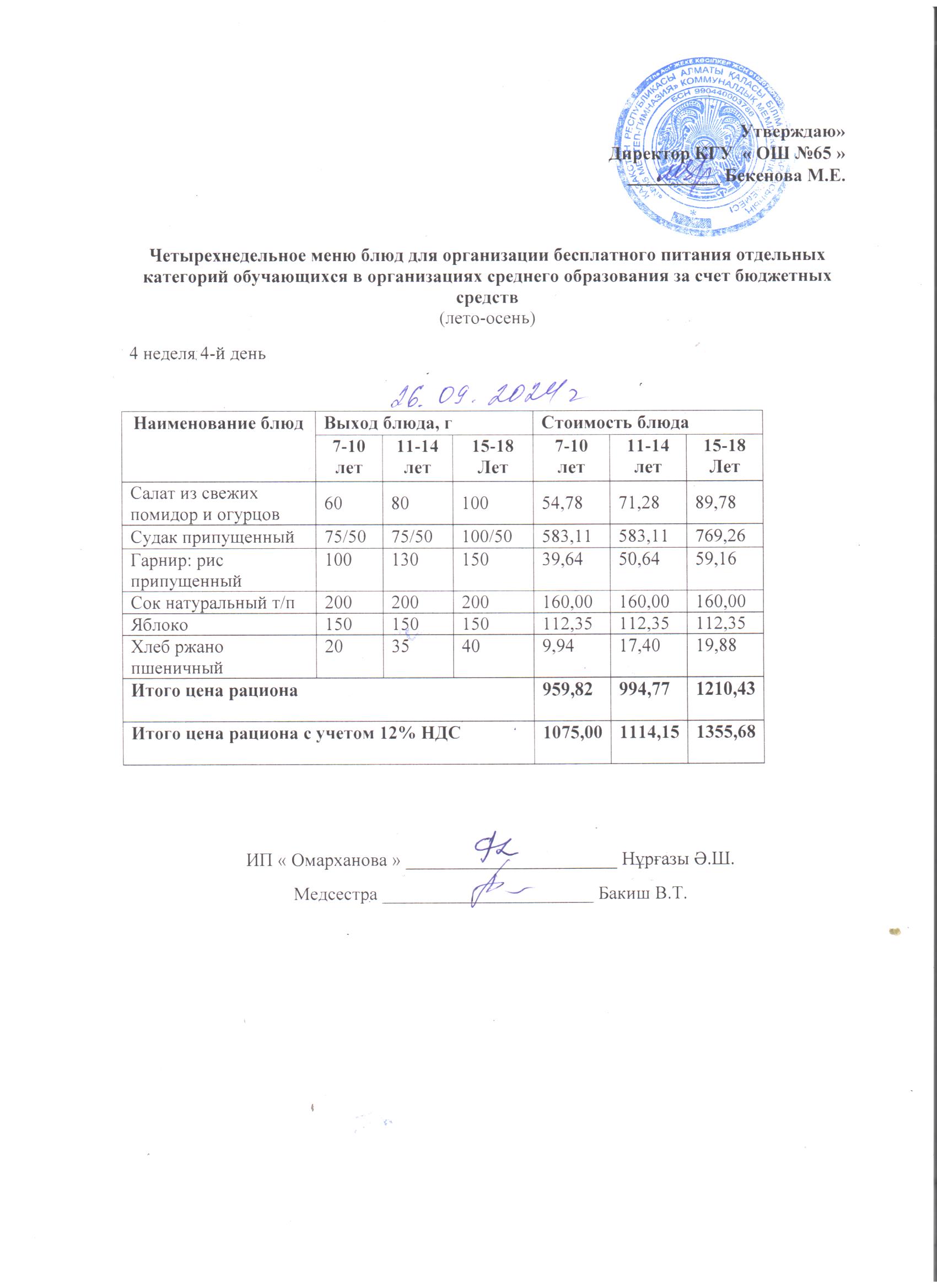 26 қыркүйек 2024 0 1 2 3 4 5 1-4 сыныптарға арналған күнделікті тегін мәзір, 5-11 сыныптардан тұратын ХӘОС үшін.26.09.2024 ж./// Ежедневное бесплатное меню для 1-4 классов