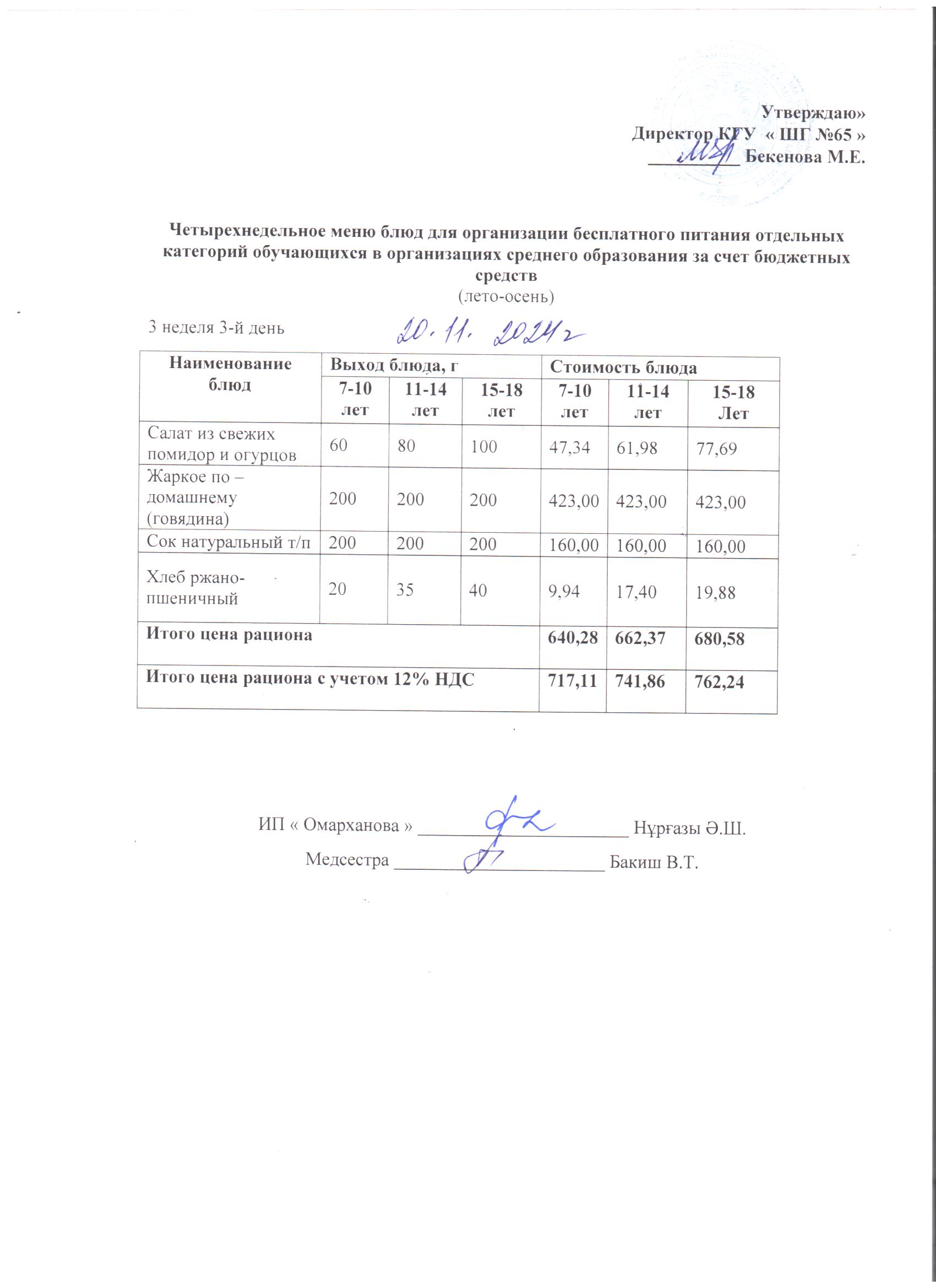 20 қараша 2024 0 1 2 3 4 5 Күнделікті тегін мәзір 1-4 сыныптар үшін, 5-11 сыныптар үшін ХӘОТ санатынан. 20.11.2024 ж./// Ежедневное бесплатное меню для 1-4кл., для 5-11кл. СУСН