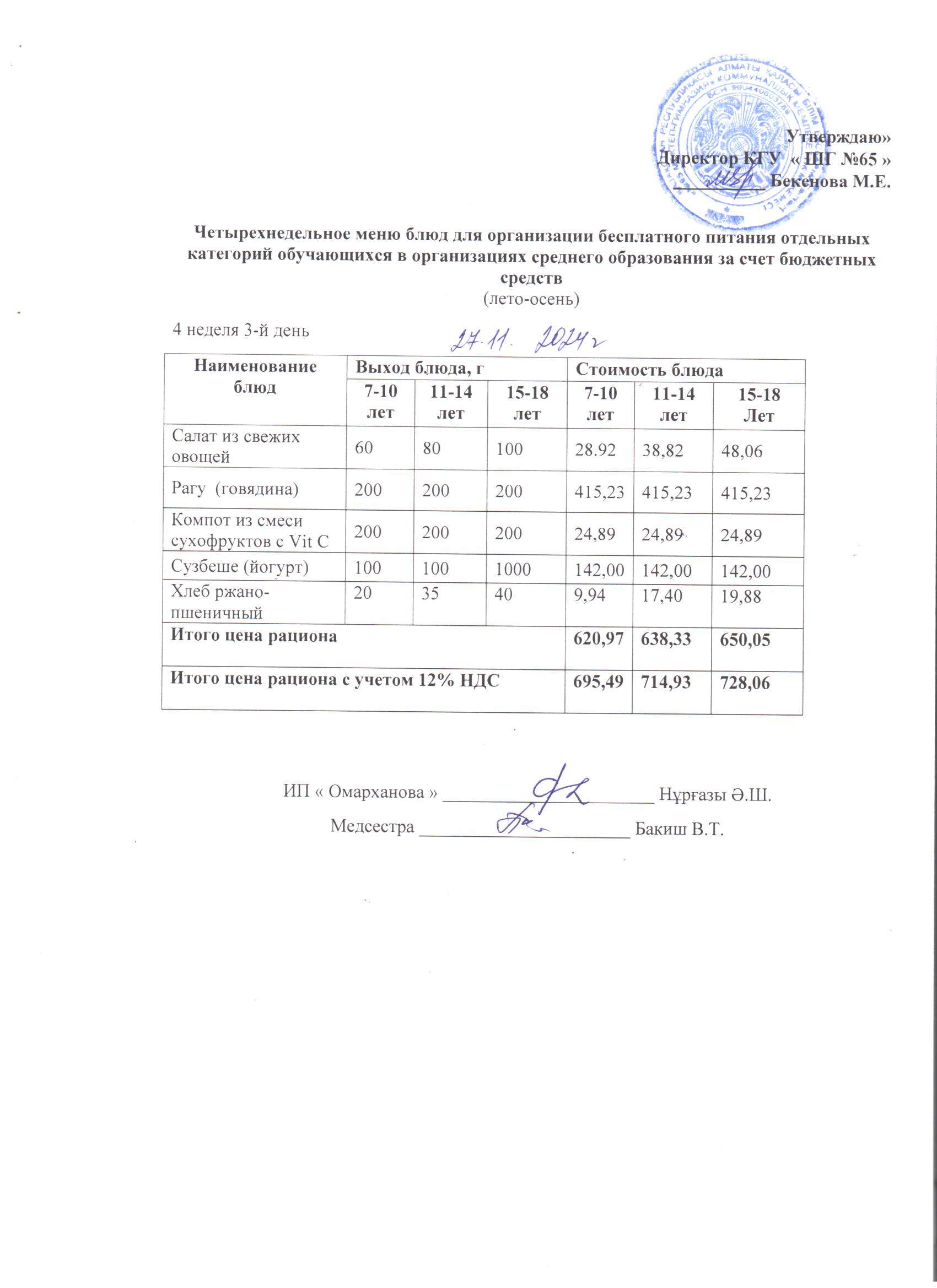 27 қараша 2024 0 1 2 3 4 5 Күнделікті тегін мәзір 1-4 сыныптар үшін, 5-11 сыныптар үшін ХӘОТ санатынан. 27.11.2024 ж./// Ежедневное бесплатное меню для 1-4кл., для 5-11кл.СУСН