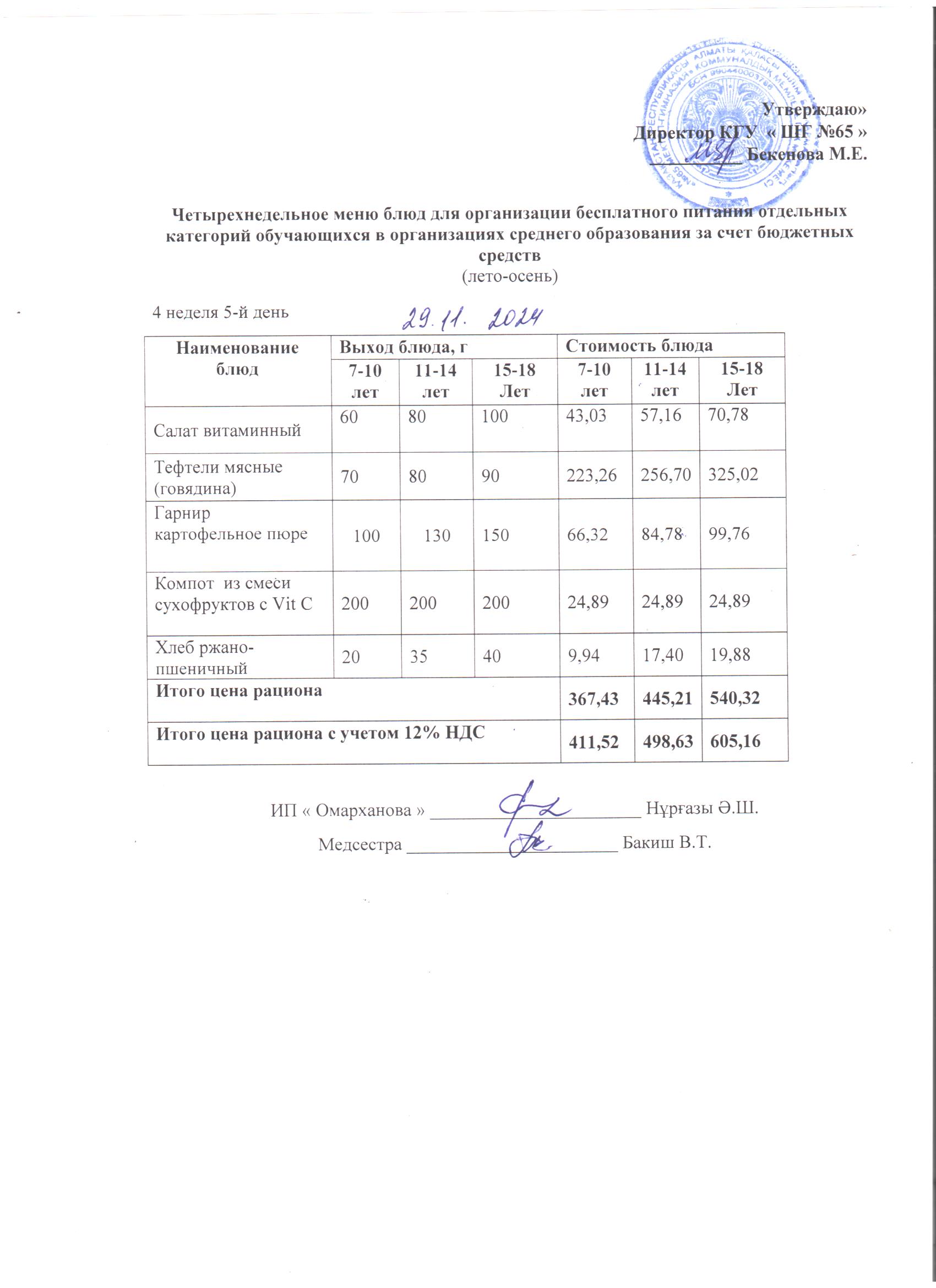 29 қараша 2024 0 1 2 3 4 5 ХӘОТ санатындағы 5-11 сыныптар үшін 1-4 сыныптарға арналған күнделікті тегін мәзір. 29.11.2024 ж./// Ежедневное бесплатное меню для 1-4кл.,для 5-11
