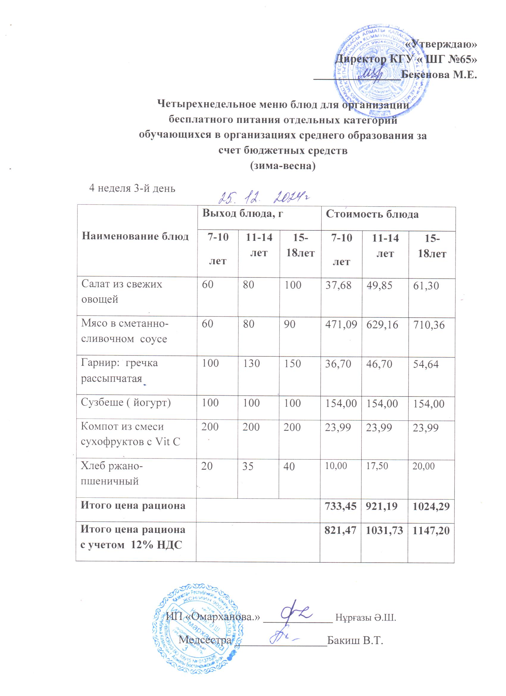 25 желтоқсан 2024 0 1 2 3 4 5 Күнделікті тегін мәзір 1-4 сыныптар үшін, 5-11 сыныптар үшін ХӘОТ санатынан. 25.12.2024 ж./// Ежедневное бесплатное меню для 1-4кл., для 5-11кл.