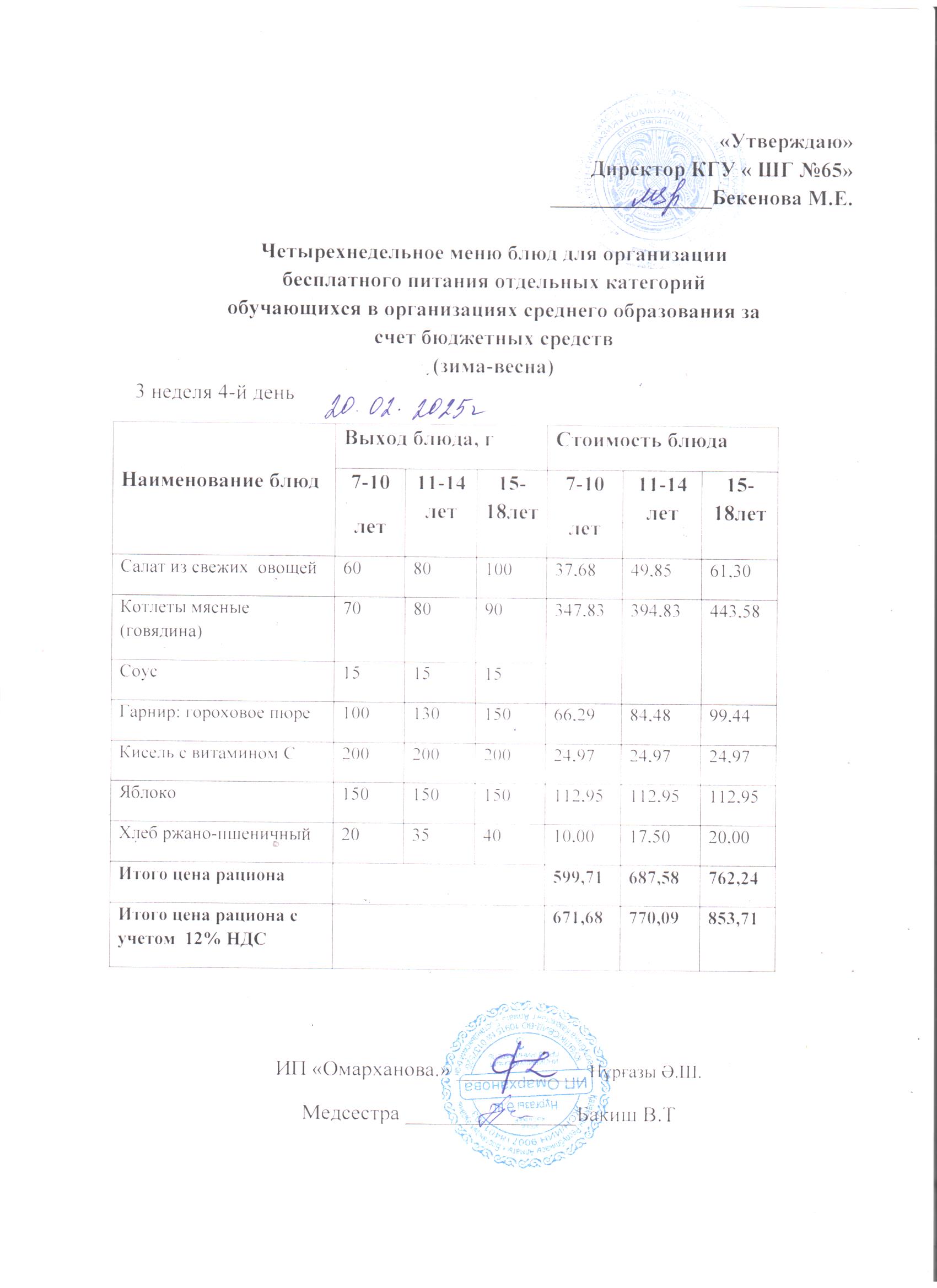 20 ақпан 2025 0 1 2 3 4 5 ХӘОТ санатындағы 5-11 сыныптар үшін 1-4 сыныптарға арналған күнделікті тегін мәзір. 20.02.2025 ж./// Ежедневное бесплатное меню для 1-4кл., для 5-11 кл. из категории СУСН.