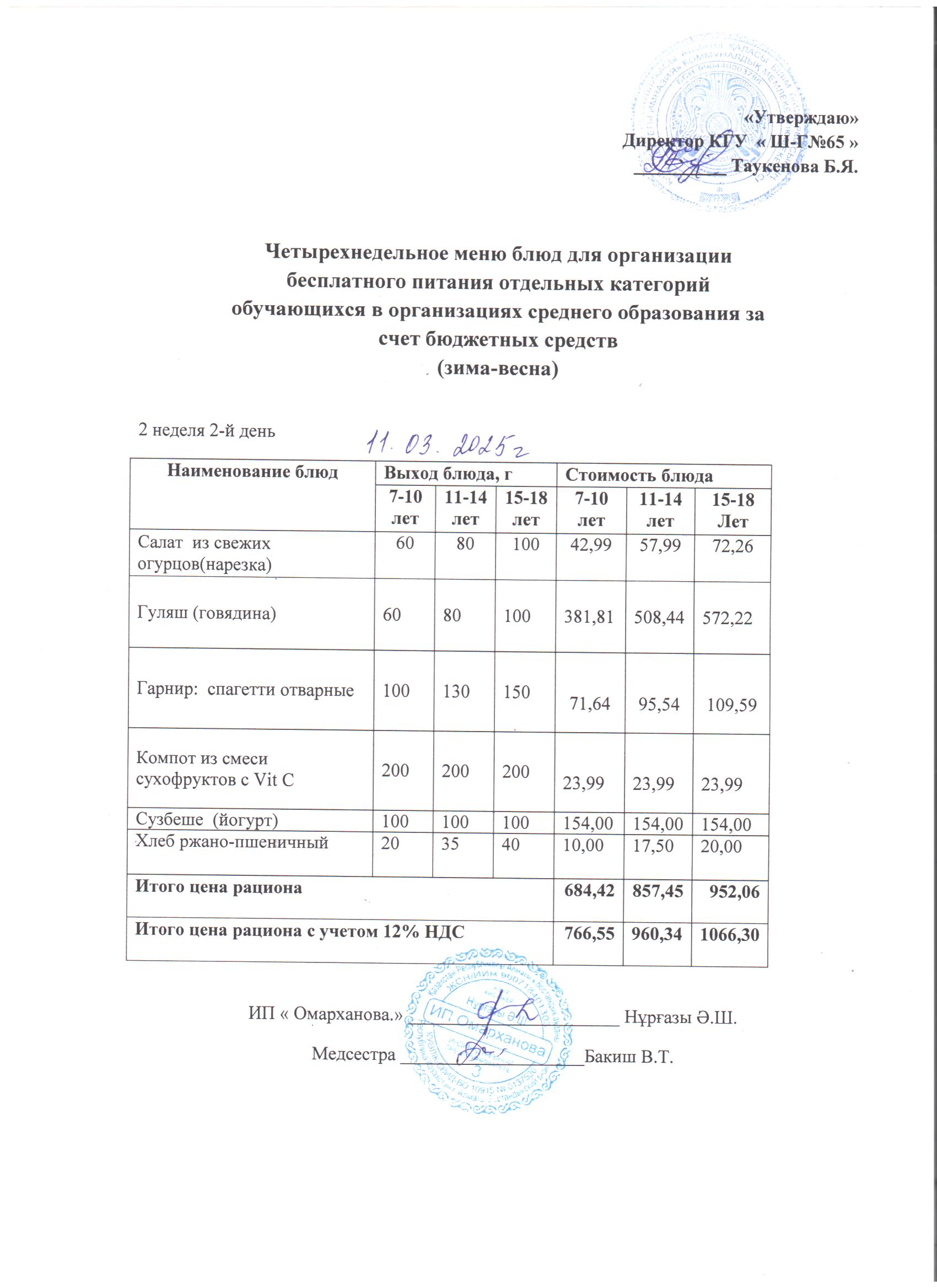 11 наурыз 2025 0 1 2 3 4 5 Күнделікті тегін мәзір 1-4 сыныптар үшін, 5-11 сыныптар үшін ХӘОТ санатынан. 11.03.2025 ж./// Ежедневное бесплатное меню 1-4кл., для 5-11кл. из категории СУСН. 11.03.2025г.