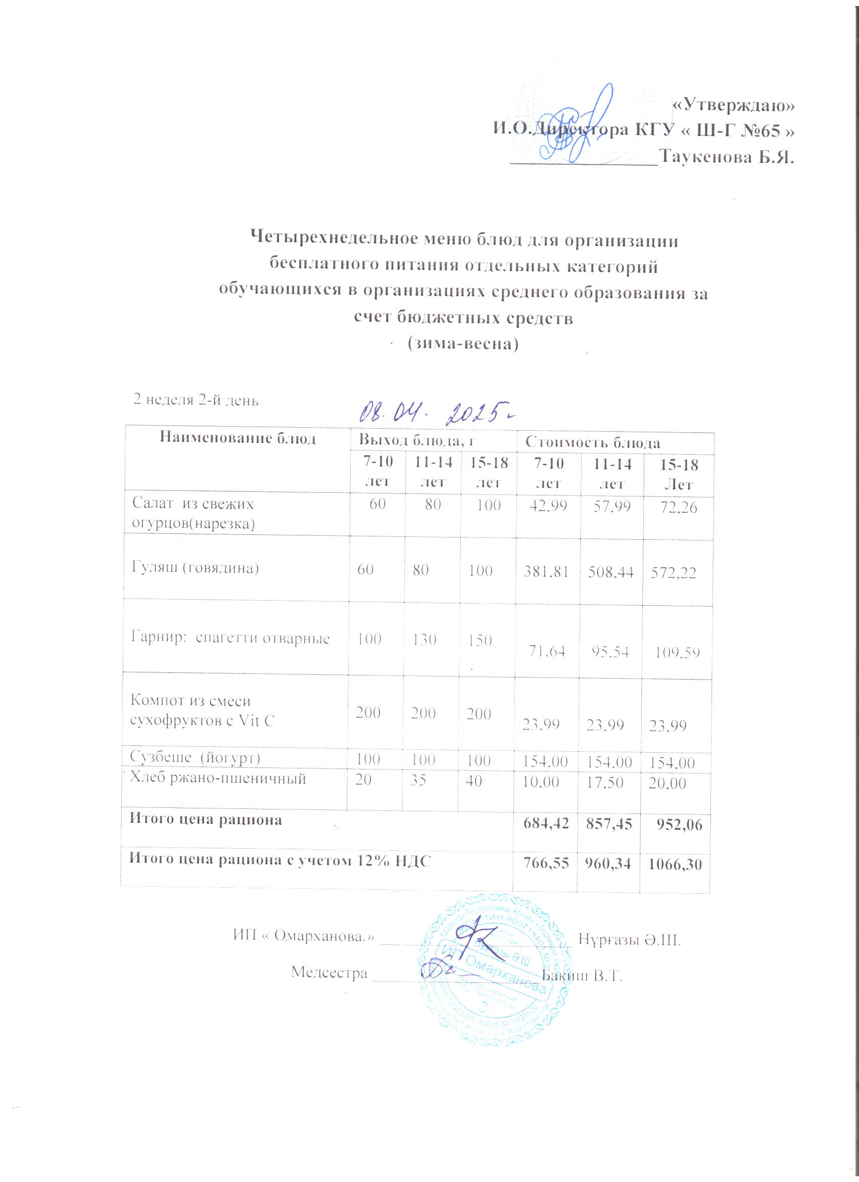 08 сәуір 2025 0 1 2 3 4 5 Күнделікті тегін мәзір 1-4 сыныптар үшін, 5-11 сыныптар үшін СУСН санатынан. 08.04.2025 ж./// Ежедневное бесплатное меню для 1-4кл.,для 5-11 кл. из категории СУСН. 08.04.2025г.