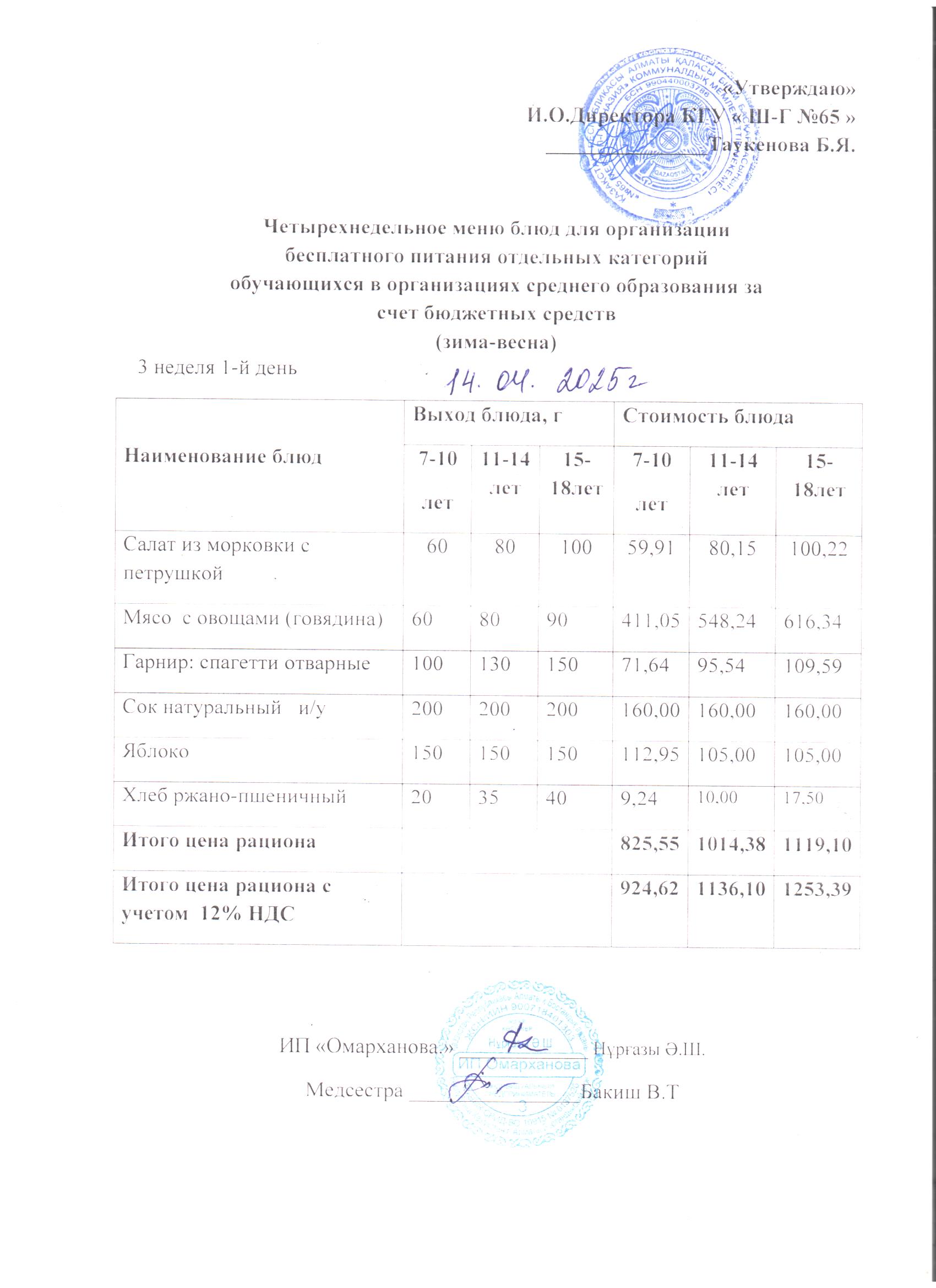 14 сәуір 2025 0 1 2 3 4 5 Күнделікті тегін мәзір 1-4 сыныптар үшін, 5-11 сыныптар үшін ХӘОТ санатынан. 14.04.2025 ж./// Ежедневное бесплатное меню для 1-4кл., для 5-11кл. из категории СУСН.