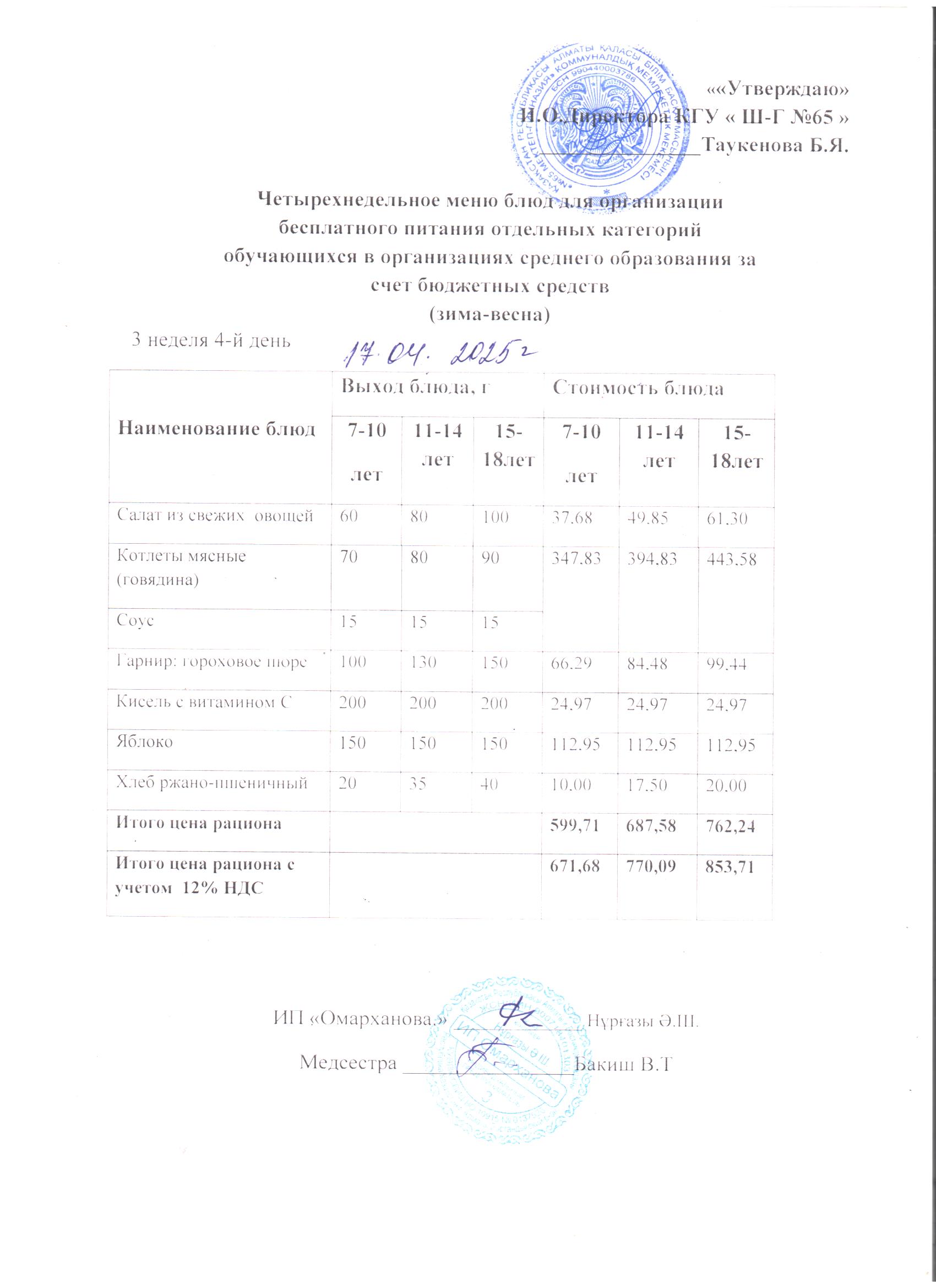 17 сәуір 2025 0 1 2 3 4 5 Күнделікті тегін мәзір 1-4 сыныптар үшін, 5-11 сыныптар үшін ХӘОТ санатынан. 17.04.2025 ж./// Ежедневное бесплатное меню для 1-4 кл., для 5-11 кл. из категории СУСН.