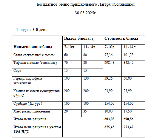 30 мамыр 2025 0 1 2 3 4 5 30.05.2025 Ж. арналған "Күншуақ" мектеп жанындағы лагерьдің тегін мәзірі./// Бесплатное меню пришкольного лагеря Солнышко на 30.05.2025 г.