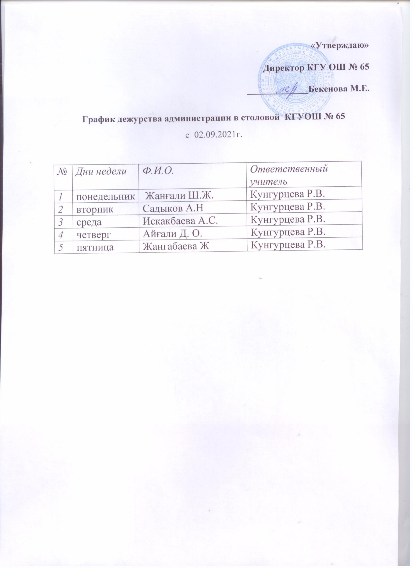 » График дежурства в столовой администрации 2021г