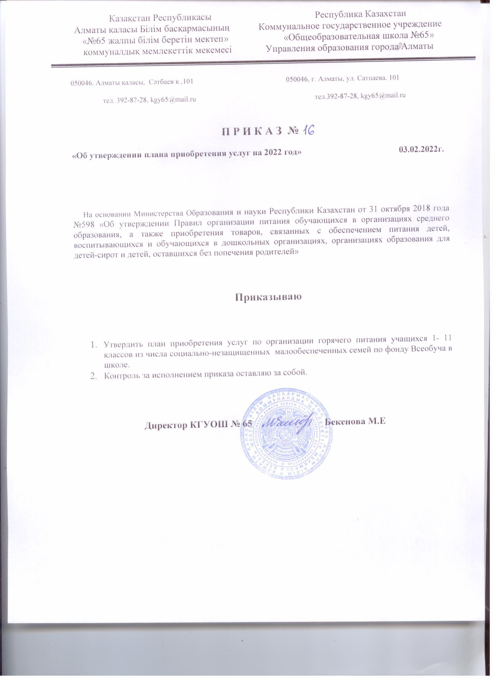» Приказ об утверждения приобретения услуг на 2022г