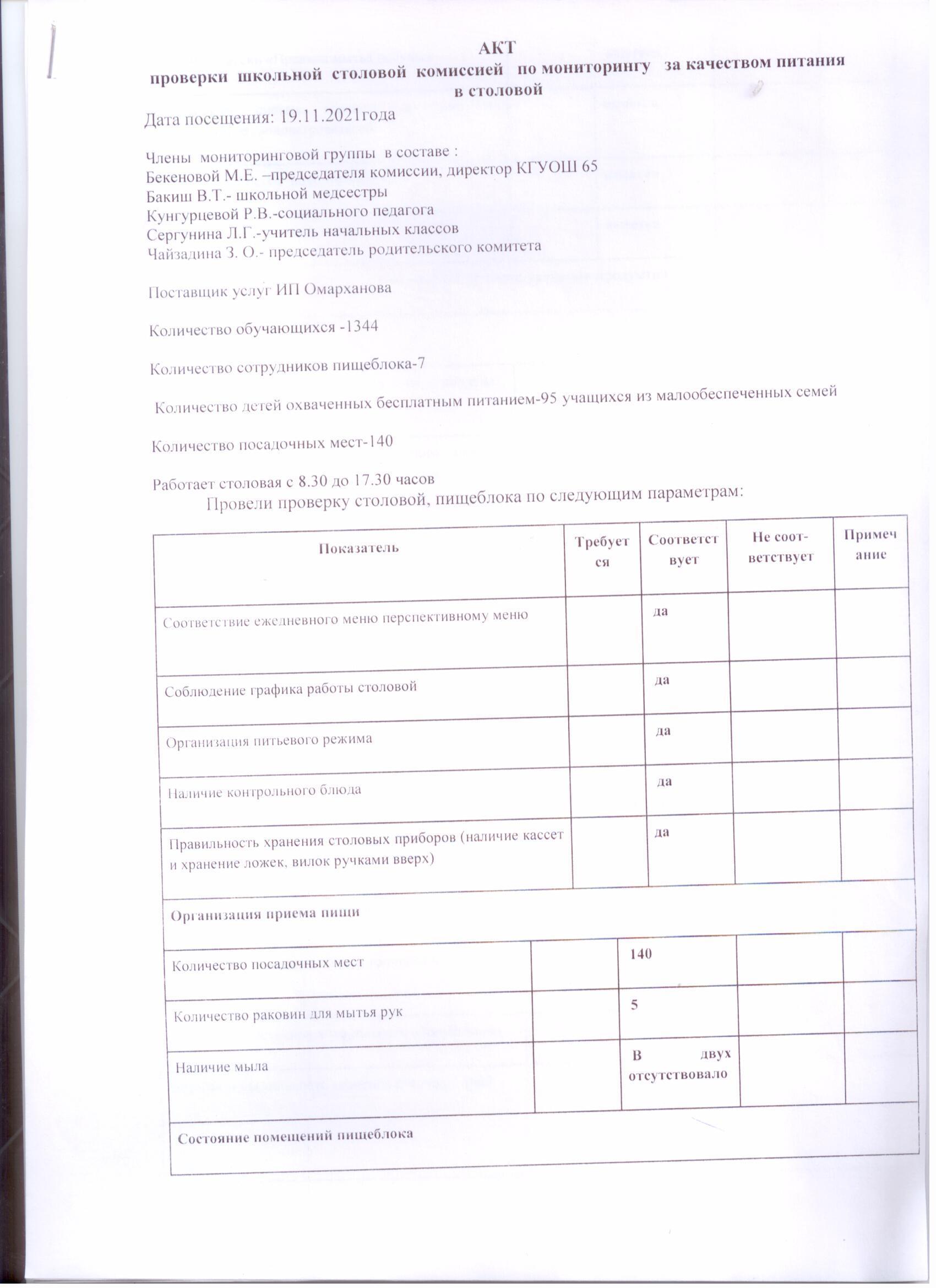 Акт проверки школьной столовой за ноябрь 2021г