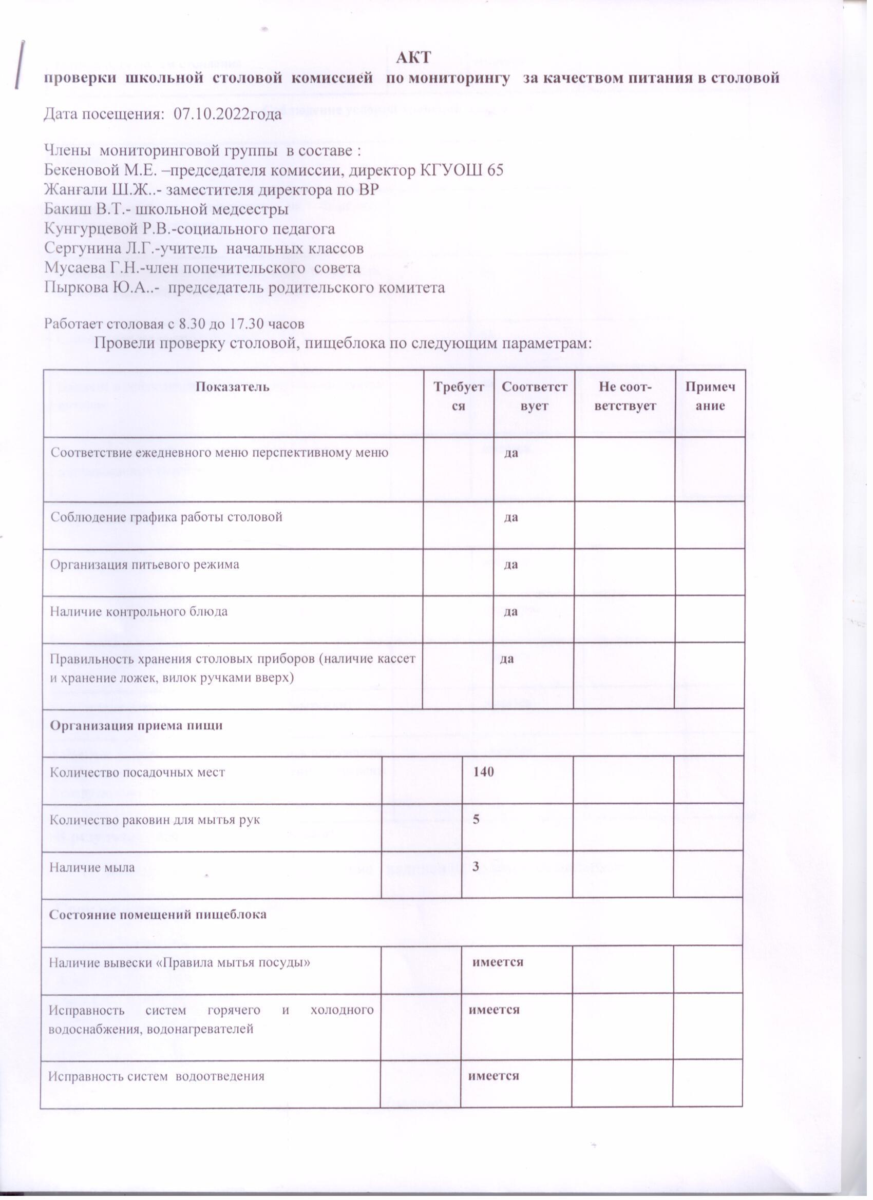 07 қазан 2022 0 1 2 3 4 5 Мектеп асханасының тамақтану сапасып бақылау комиссиясының тексеру-Акт проверки школьной столовой комиссией по мониторингу за качеством питания