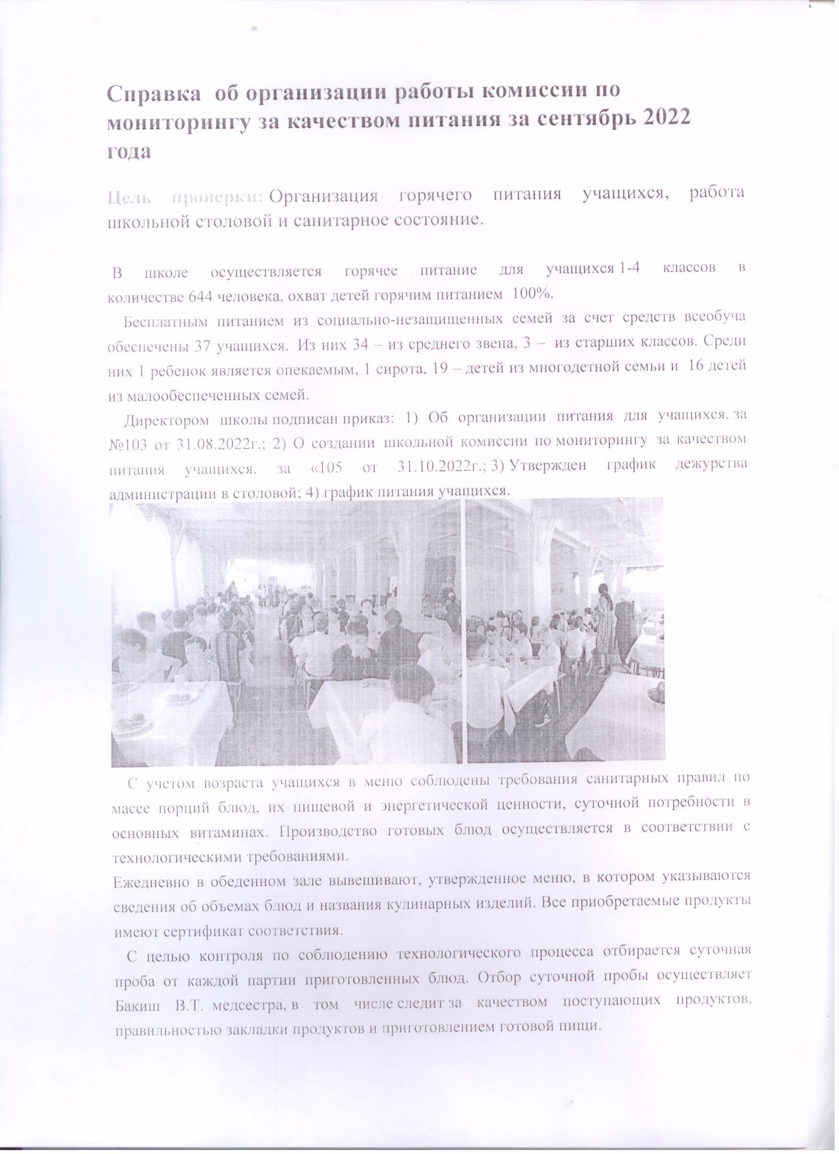 30 қыркүйек 2022 0 1 2 3 4 5 2022 жылғы қыркүйекке тамақтану сапасын бақылау жөніндегі комиссияның жұмысын ұйымдастыру туралы ақпарат.// Справка об организации работы комиссии