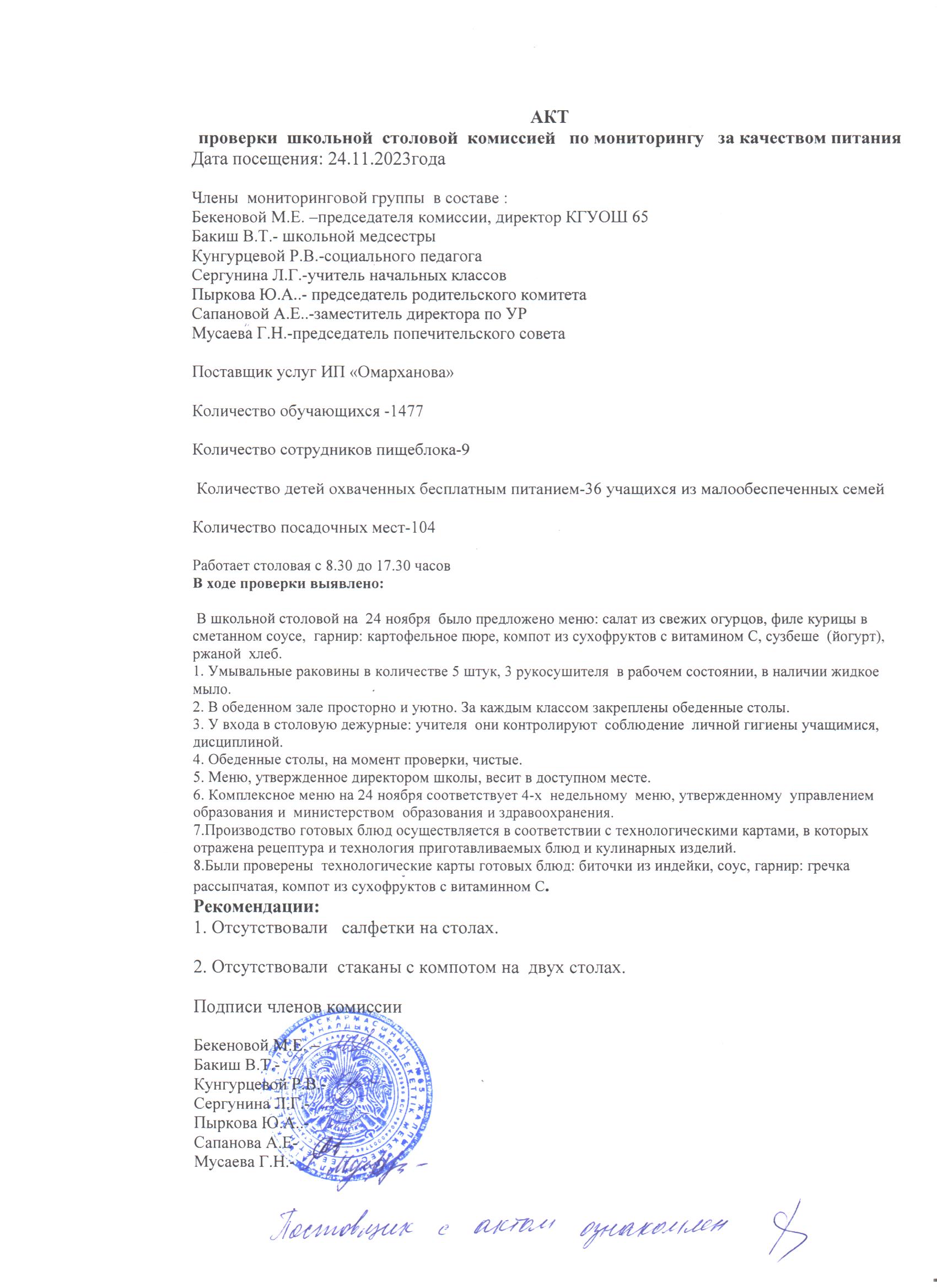 24 қараша 2023 0 1 2 3 4 5 Мектеп асханасын тексеру актісі 24.11.2023 ж./// Акт проверки школьной столовой 24.11.2023г.