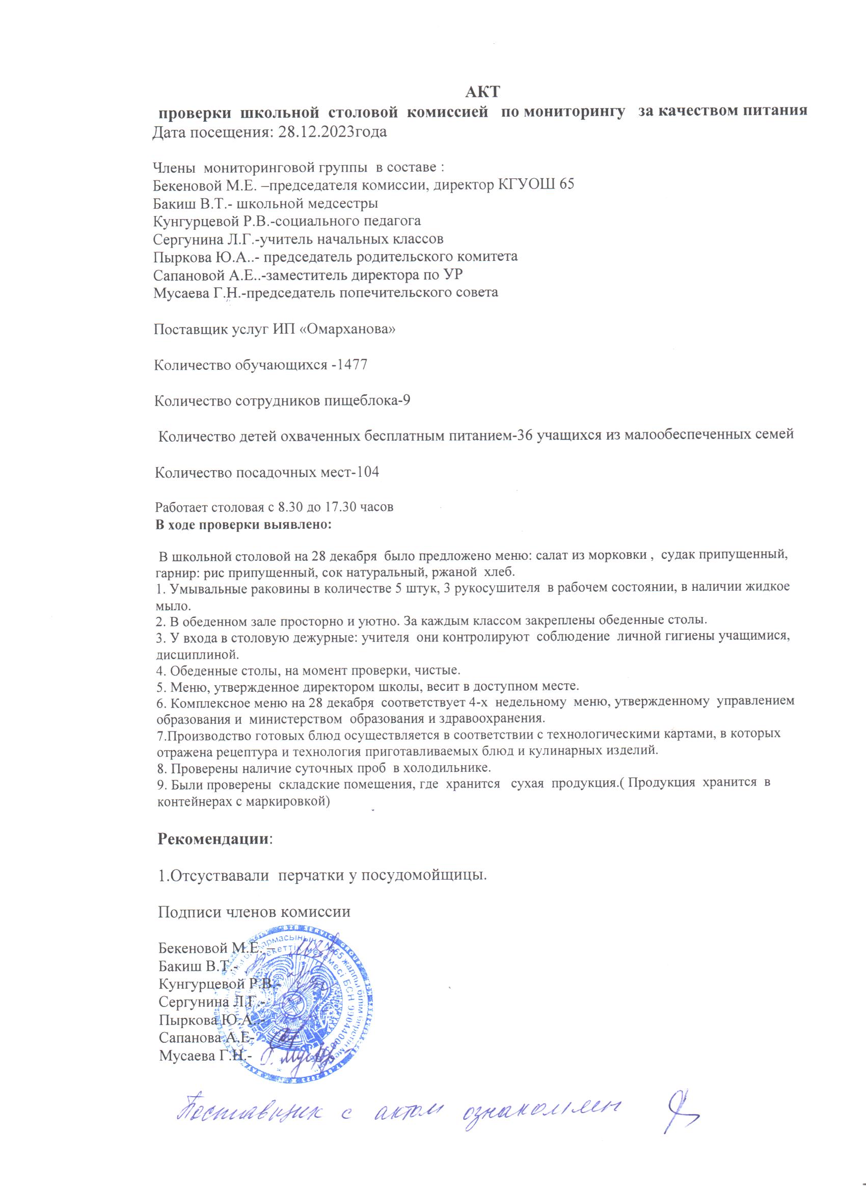 28 желтоқсан 2023 0 1 2 3 4 5 Мектеп асханасын тексеру актісі 28.12.2023 ж./// Акт проверки школьной столовой 28/.12.2023г.