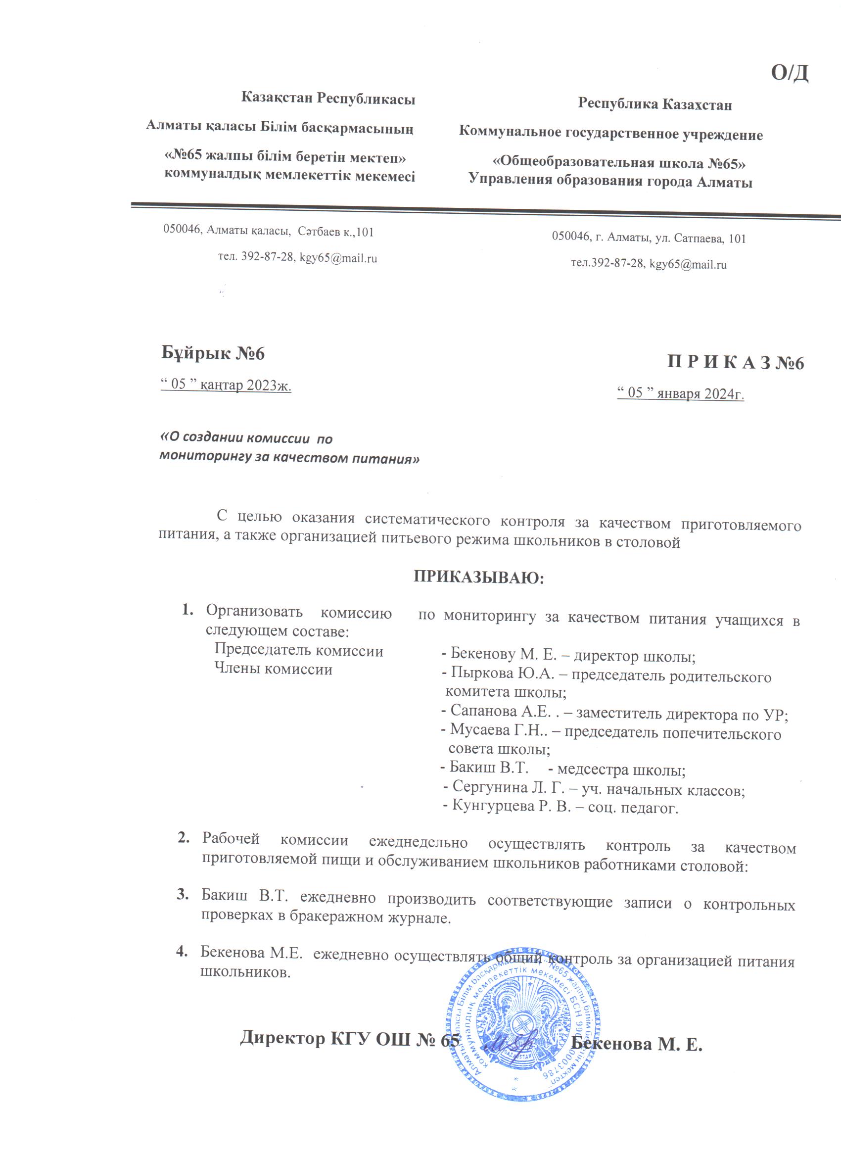 05 қаңтар 2024 0 1 2 3 4 5 "Тамақтану сапасына мониторинг жүргізу жөніндегі комиссия құру туралы" № 6 бұйрық 05.01.2024 ж./// Приказ №6 " О создании комиссии по мониторингу "