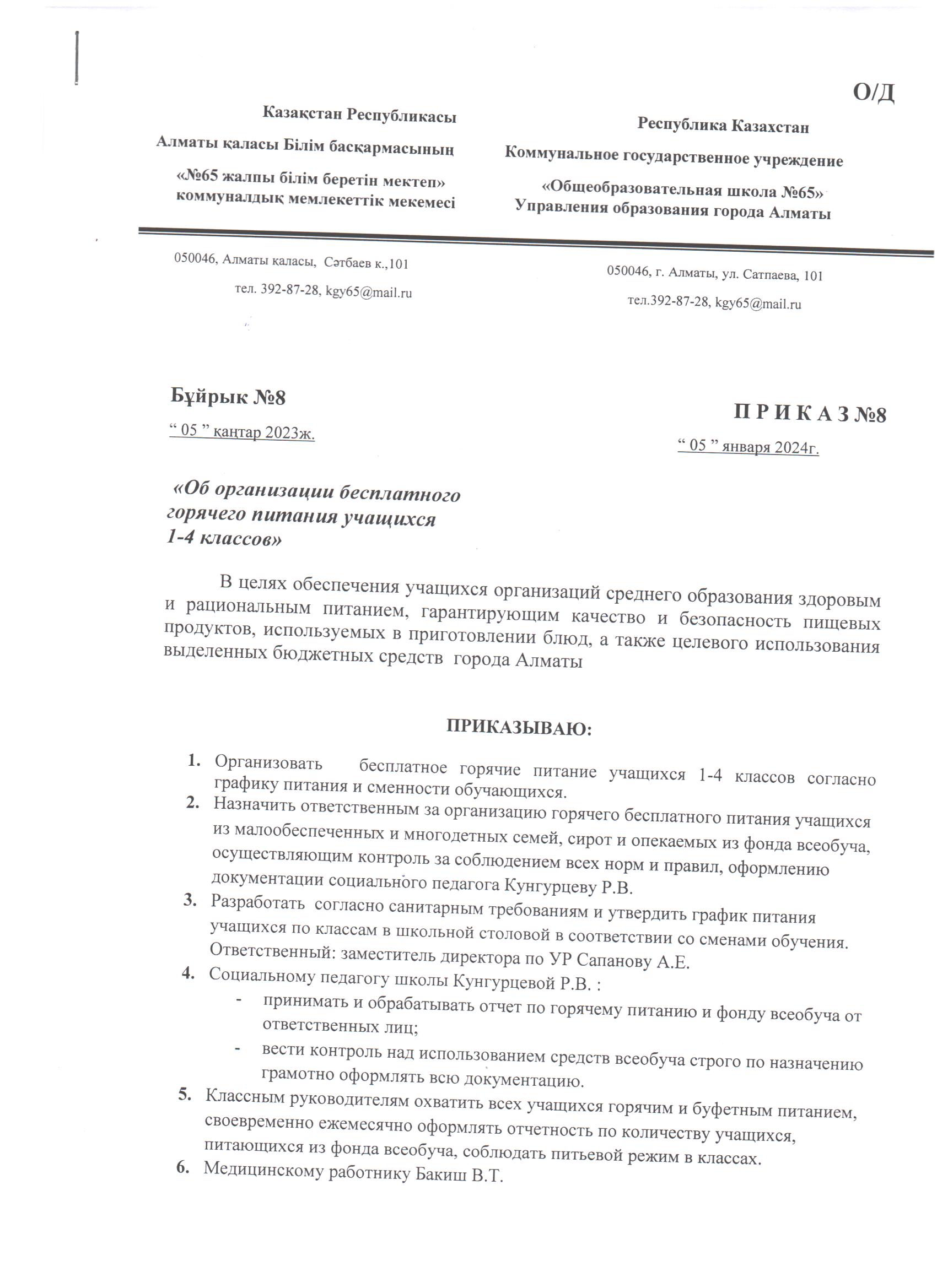 05 қаңтар 2024 0 1 2 3 4 5 "1-4 сынып оқушыларына тегін ыстық тамақ беруді ұйымдастыру туралы" №8 бұйрық 05.01.2024 ж./// Приказ№8 " Об организации бесплатного горячего питания"