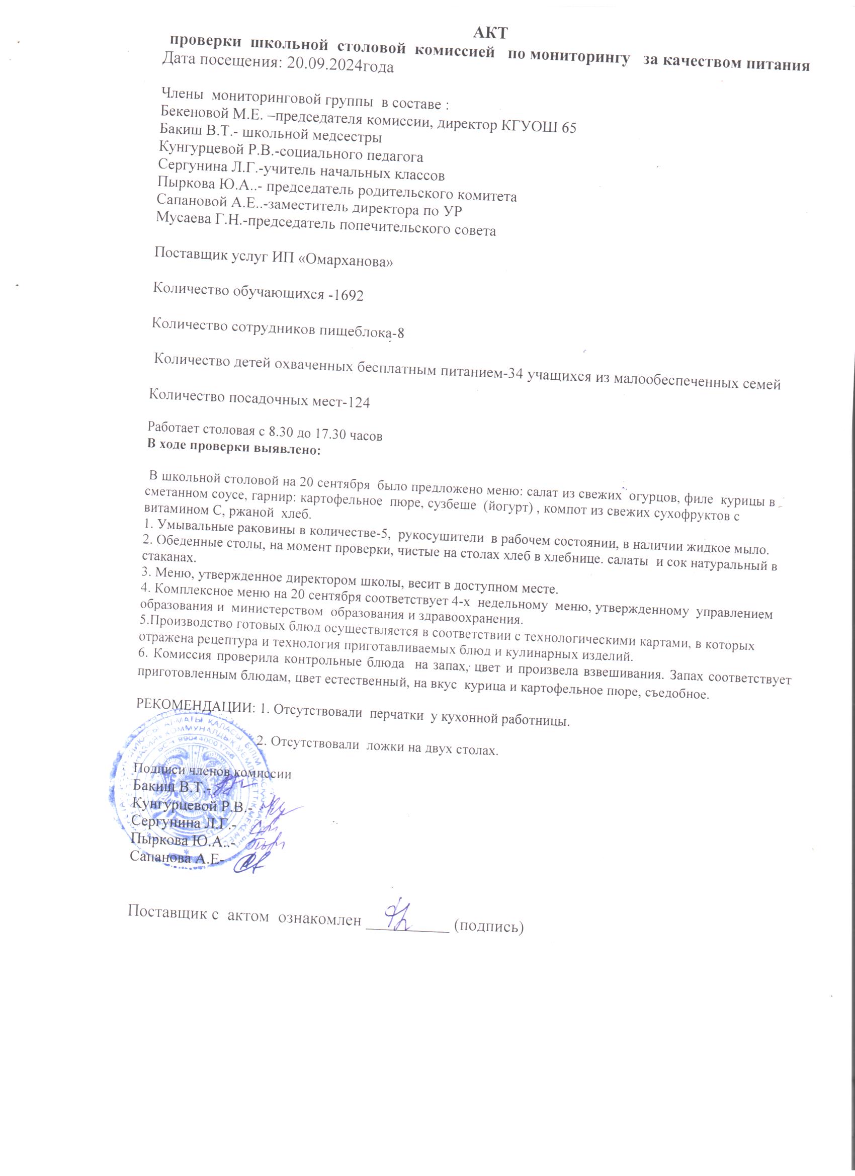 20 қыркүйек 2024 0 1 2 3 4 5 Мектеп асханасын тексеру актісі 20.09.2024 ж./// Акт проверки школьной столовой 20.09.2024г.