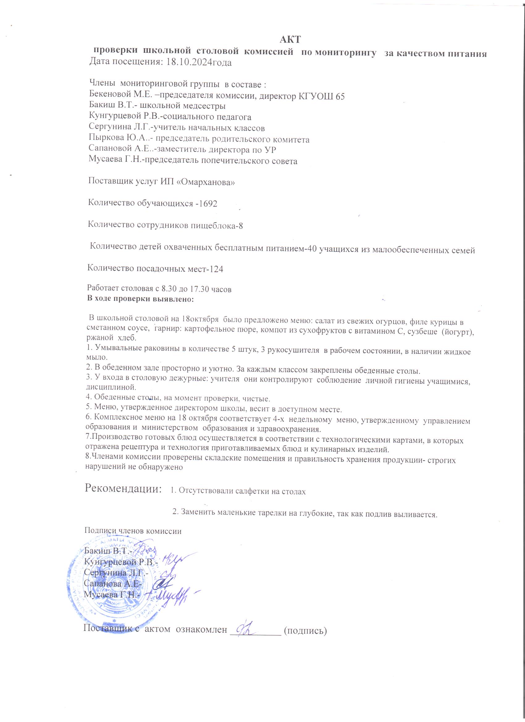 18 қазан 2024 0 1 2 3 4 5 Тамақтану сапасын бақылау жөніндегі комиссияның мектеп асханасын тексеру актісі.18.10.2024 ж./// Акт проверки школьной столовой 18.10.2024г.