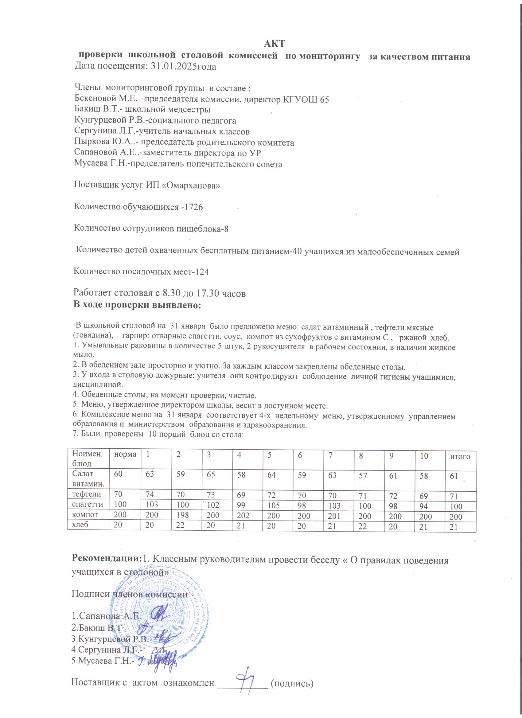 31 қаңтар 2025 0 1 2 3 4 5 Мектеп асханасын тексеру актісі 31.01.2025 ж./// Акт проверки школьной столовой 31.01.2025г.
