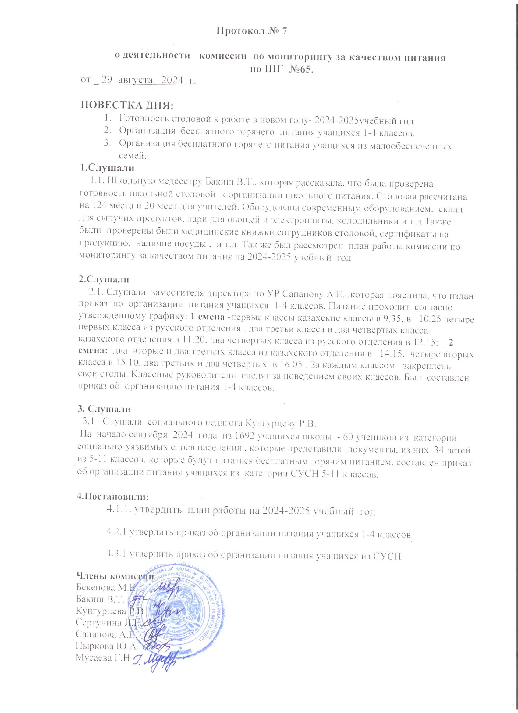 2024 жылғы 29 тамыздағы №65 мектеп бойынша тамақтану сапасына мониторинг жүргізу жөніндегі комиссияның қызметі туралы №7 хаттама./// Протокол №7 о деятельности комиссии по мониторингу за качеством питания от 29.08.2024г
