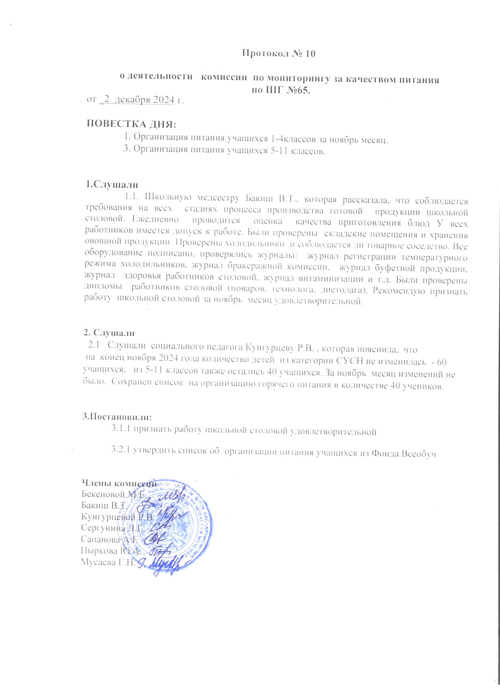 2024 жылғы 02 желтоқсандағы№65 МГ бойынша тамақтану сапасына мониторинг жүргізу жөніндегі комиссияның қызметі туралы № 10 хаттама.///протокол №10 о деятельности комиссии по мониторингу за качеством питания по ШГ №65 от 02.12.2024г.