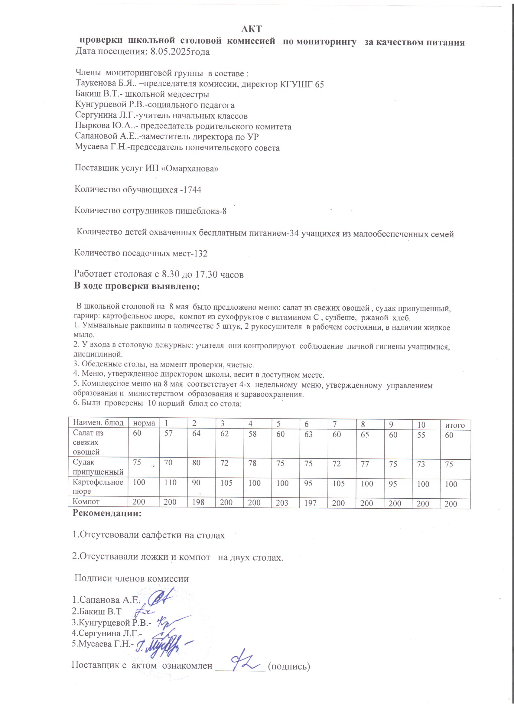 08 мамыр 2025 0 1 2 3 4 5 08.05.2025 ж. бракераж комиссиясының мектеп асханасын тексеру актісі./// Акт проверки школьной столовой бракеражной комиссией за 08.05.2025г.