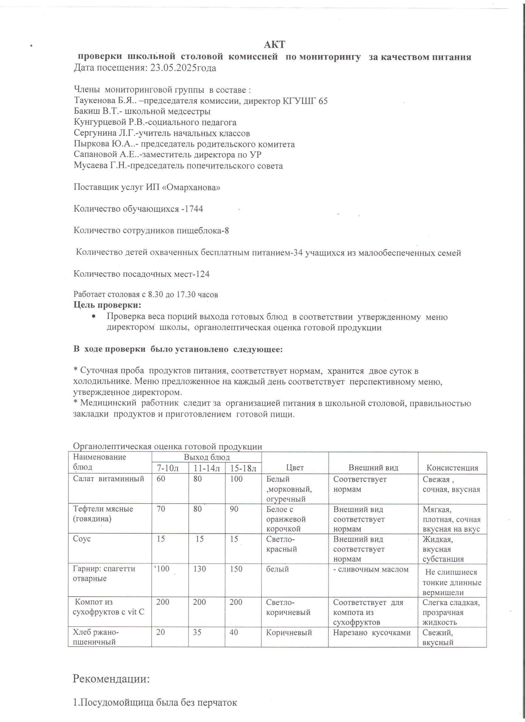 23 мамыр 2025 0 1 2 3 4 5 23.05.2025 үшін бракераждық комиссияның мектеп асханасын тексеру актісі./// Акт проверки школьной столовой бракеражной комиссией за 23.05.2025г