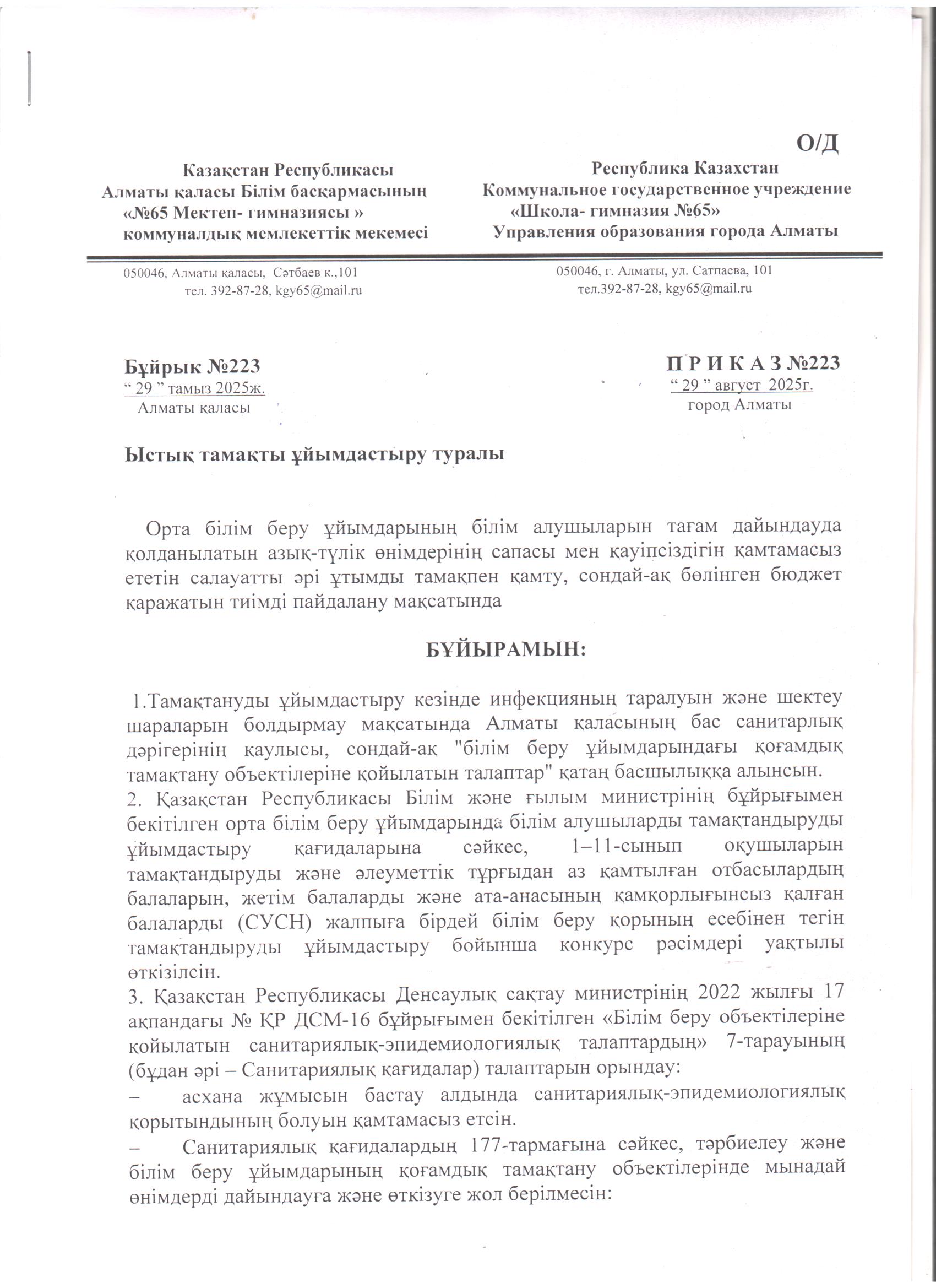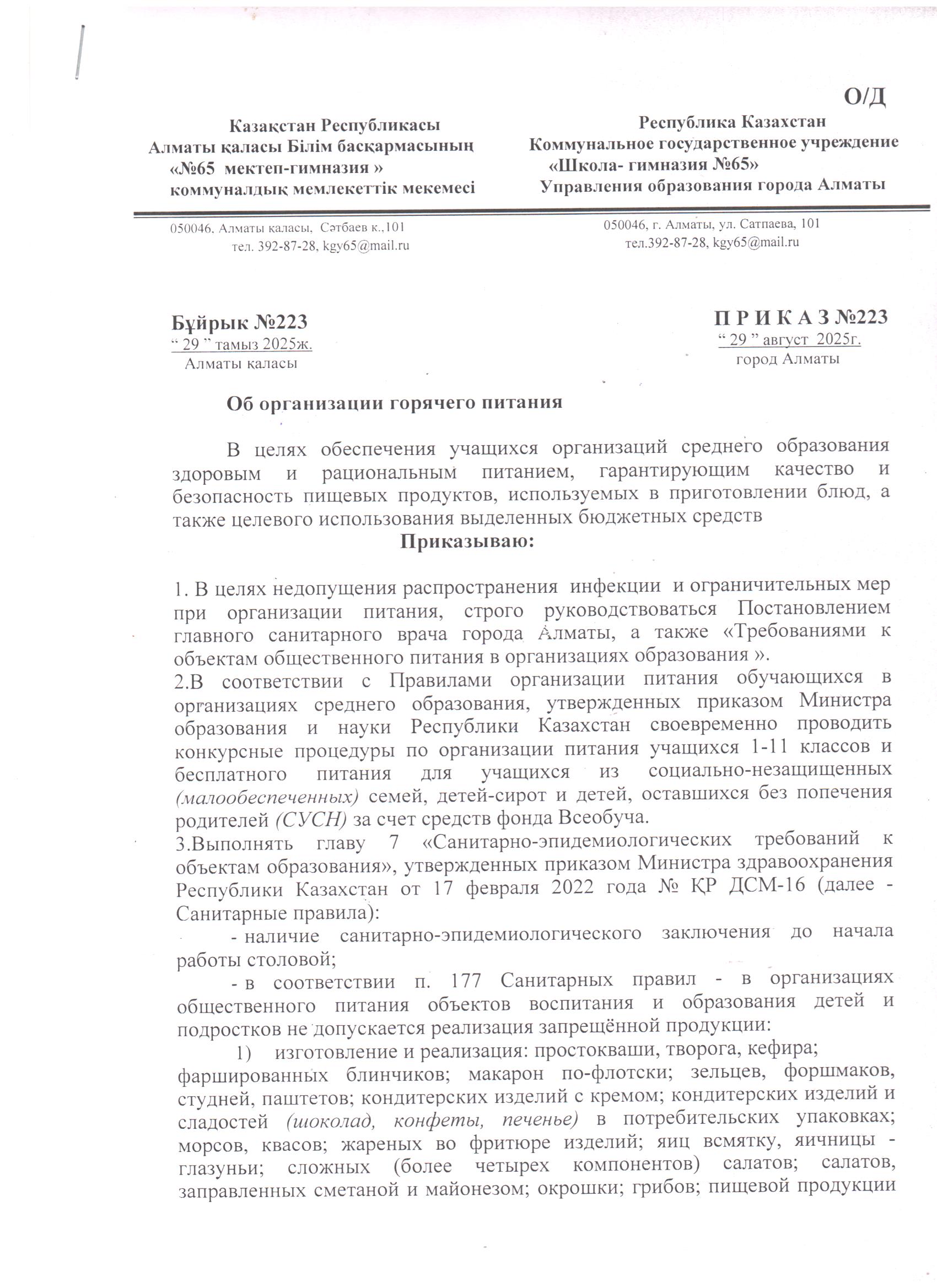 29 тамыз 2025 0 1 2 3 4 5 2025-2026 оқу жылына арналған" ыстық тамақты ұйымдастыру туралы " бұйрық/// Приказ " Об организации горячего питания" на 2025-2026 учебный год