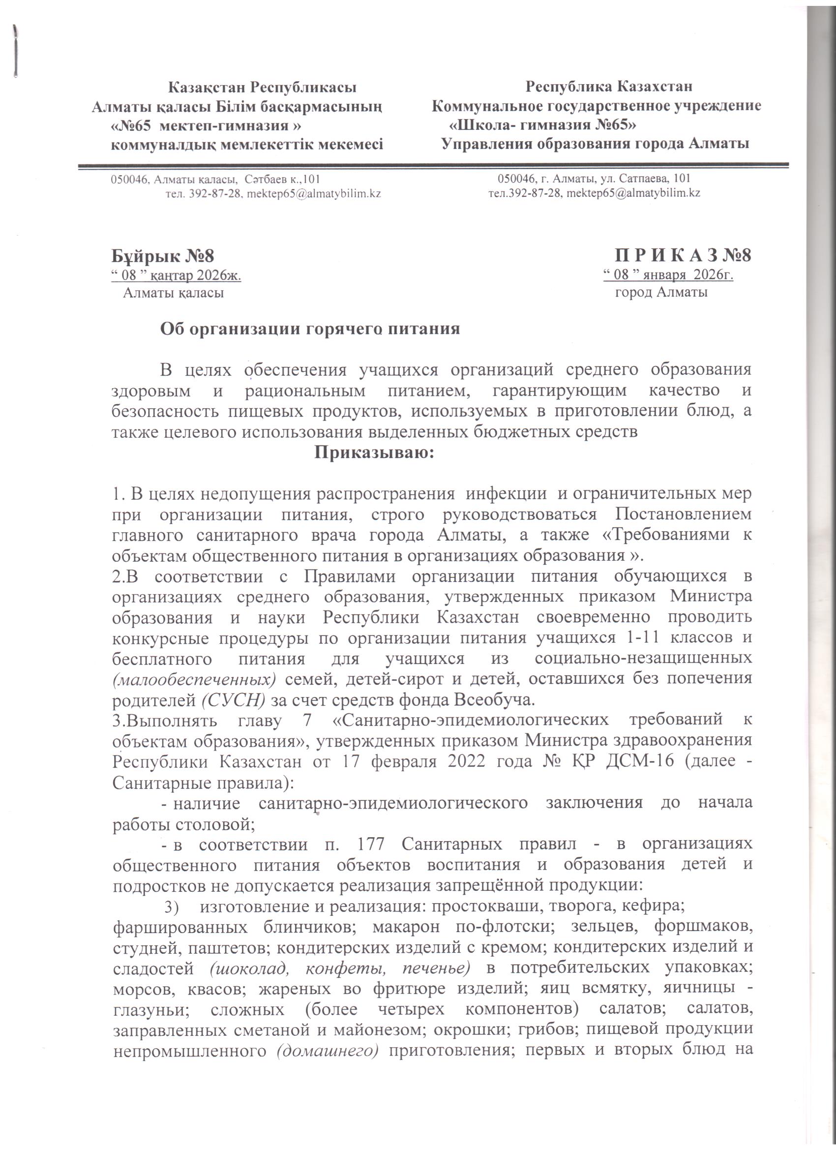 08 қаңтар 2026 0 1 2 3 4 5 Ыстық тамақты ұйымдастыру туралы 08.01.2026 ж. №8 бұйрық./// Приказ №8 об организации горячего питания от 08.01.2026г.