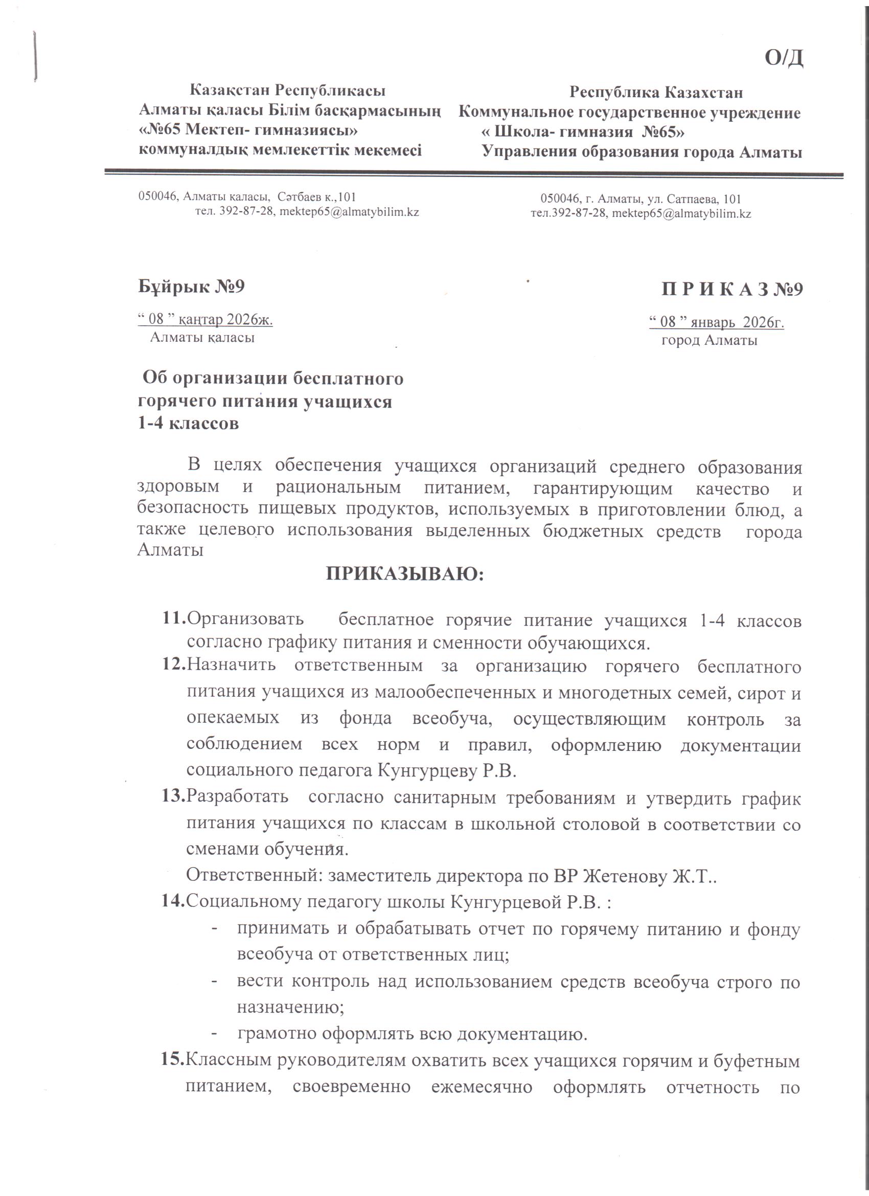 08 қаңтар 2026 0 1 2 3 4 5 1-4 сынып оқушыларына тегін ыстық тамақ беруді ұйымдастыру туралы 08.01.2026 ж. №9 бұйрық./// Приказ №9 об организации бесплатного горячего питания учащихся 1-4 классов от 08.01.2026г.